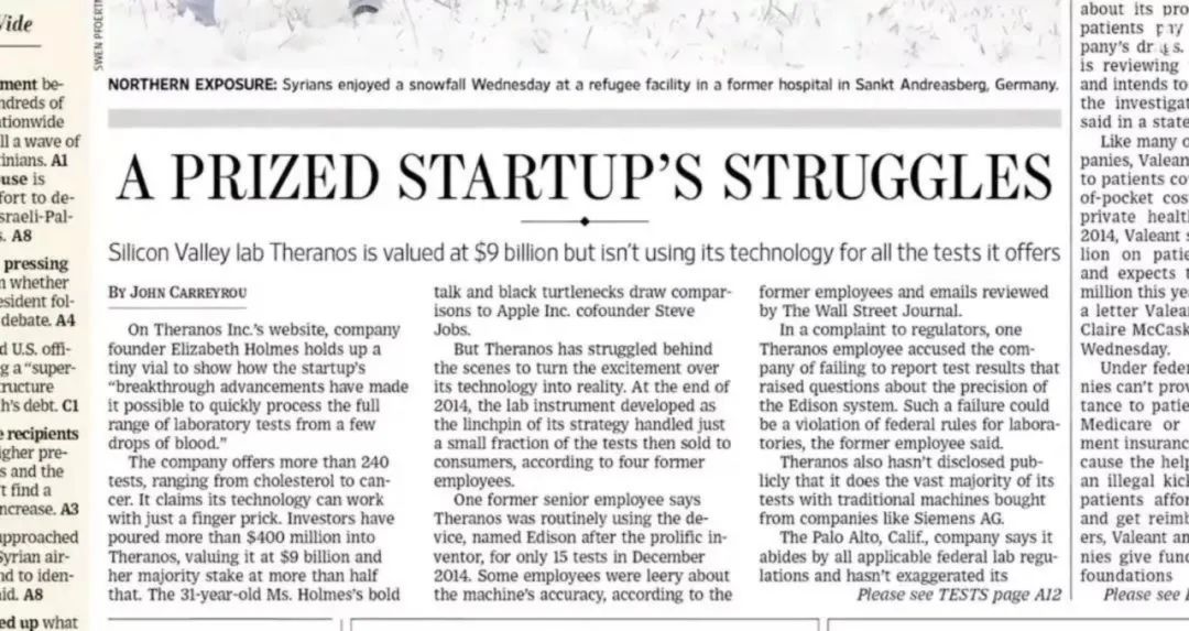 起因是《华尔街日报》在当日发表的一篇头版头条,题为《一家明星创业公司的挣扎》(A Prized Startup’s Struggles),从内容来看,这更像是一份针对Theranos的调查报告。