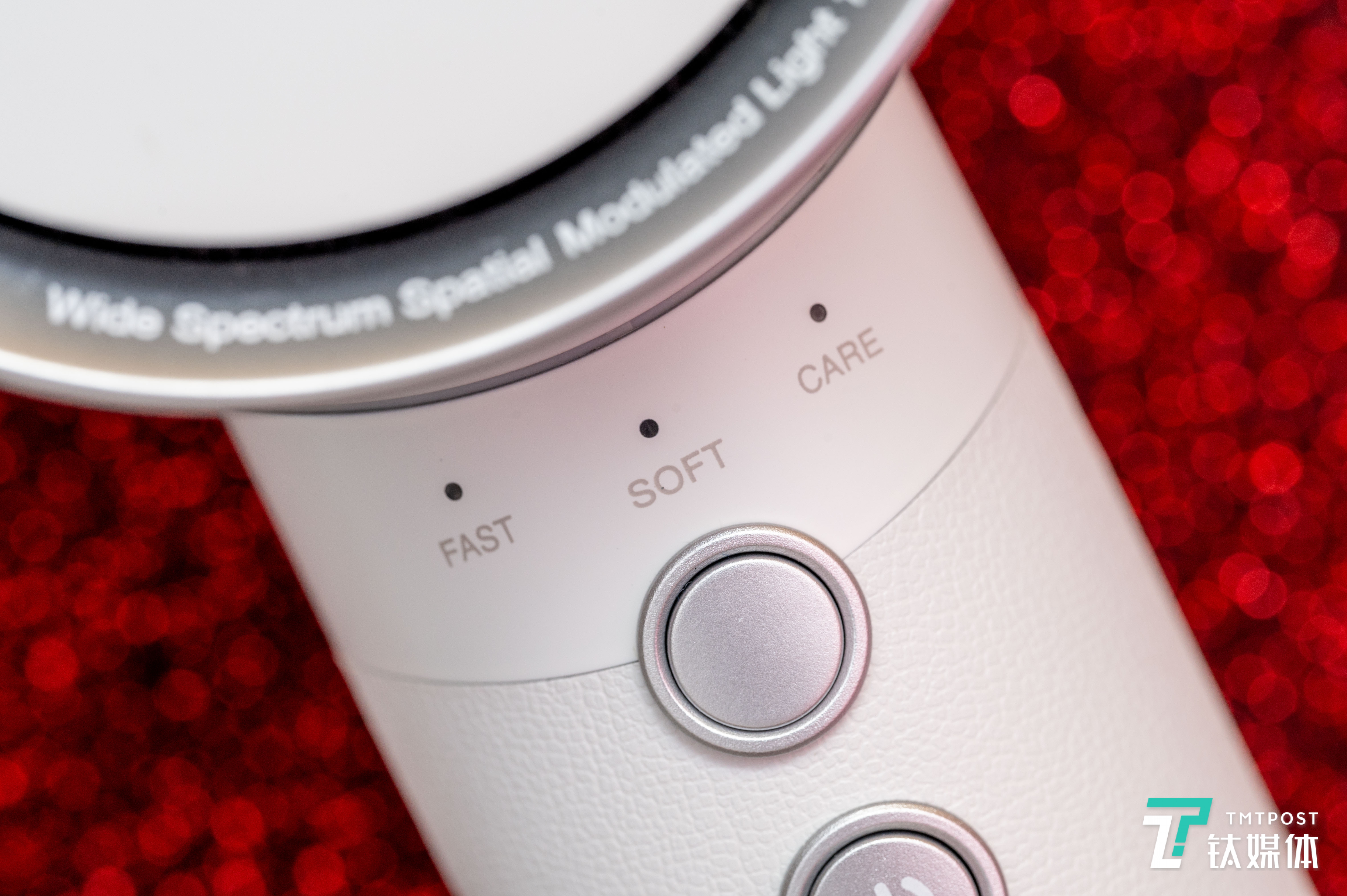 吹风机的操作区域集中于握把顶部,上部为模式选择按键,下部为电源键,机器共有3个档位可供选择,前两个档位为光能+自然风的干发模式,区别主要在于光和风的强度,快干模式,光风配比最大,快速干发。柔和模式,适合头发敏感及儿童,最后一个档位为纯风模式。