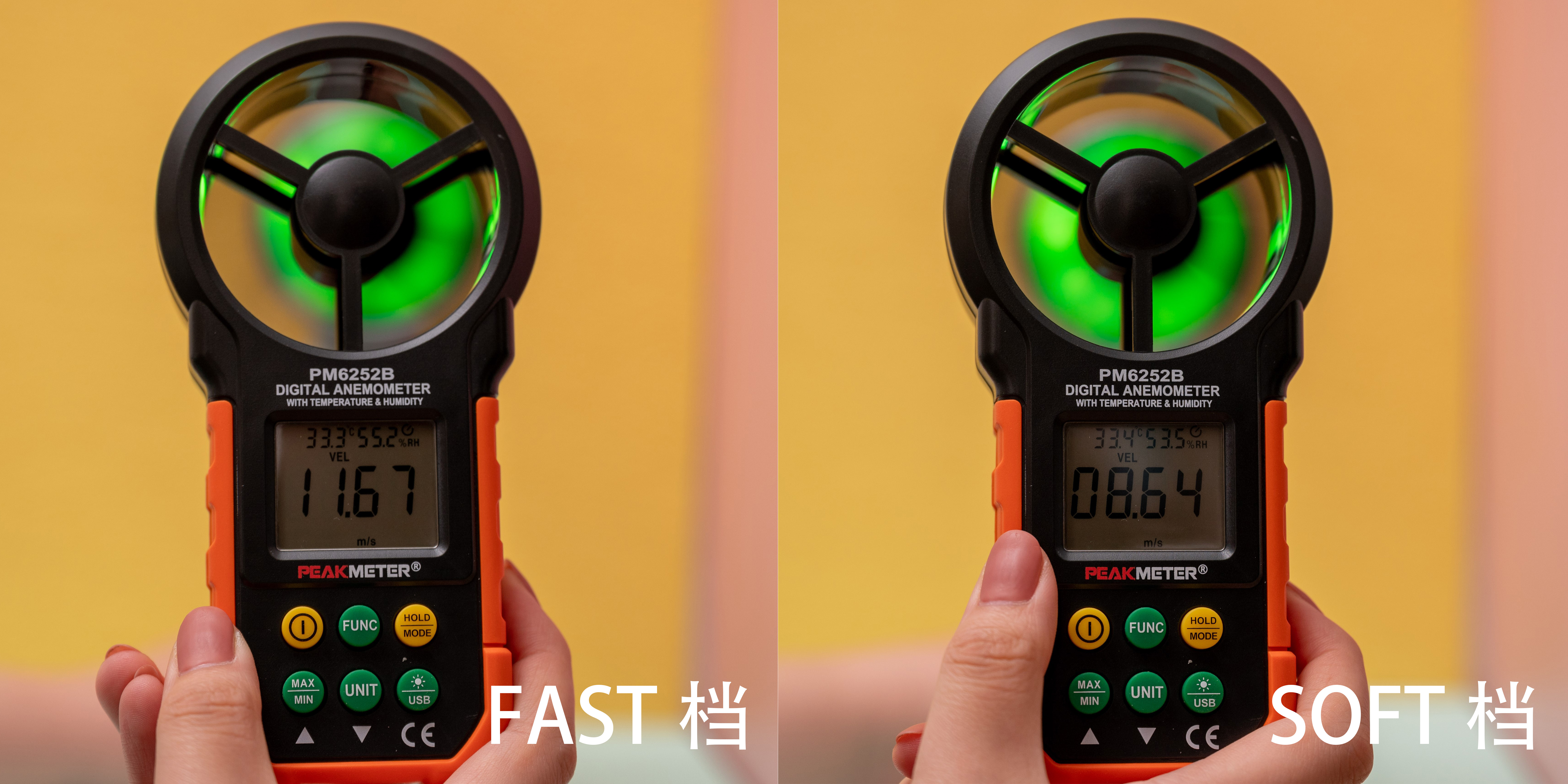 除了光能系统带来热量传递以外,Zuvi原里光能无线吹风机同样也配备了转速达到10万的电机系统,这也使得它的风力流速与戴森的产品相当,进一步提升了整体的干发速度。实测在0.5米的距离上,FAST档位风量可以达到11.67m³/s,SOFT模式则为8.64m³/s,都是吹风机产品中的顶级水平。