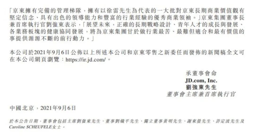 9月6日,京东集团宣布,京东零售CEO徐雷升任京东集团总裁;京东健康CEO辛利军出任京东零售CEO,京东健康医药部负责人金恩林出任京东健康CEO。