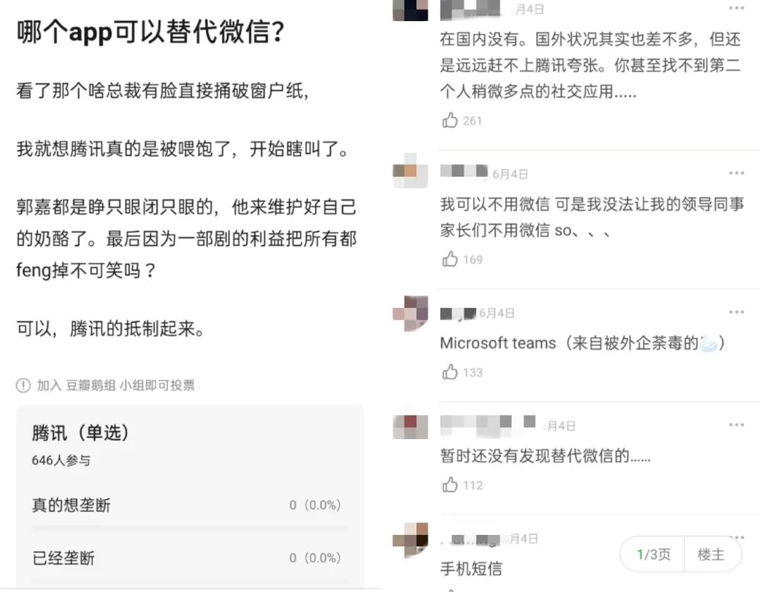 “我可以不用微信,但我没法让我的领导同事家长们不用微信……”今年6月,豆瓣的著名产瓜小组“鹅组”,有人发帖讨论《哪个APP可以替代微信》,想要逃离微信的人不在少数,他们开始觉得,用微信不是因为功能,而是因为所有人都在这里。