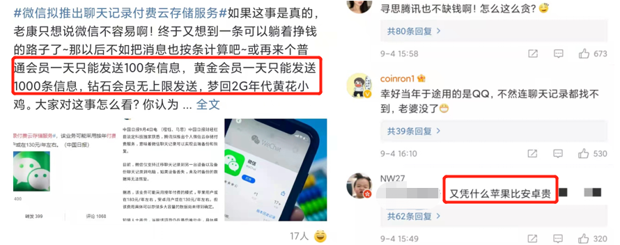 这群用户认为,微信越来越像QQ了,基础功能也要付费,目前钉钉可以免费刷新获得一年的聊天记录,飞书等则可以永久保存聊天记录,腾讯急着付费有点“不要脸”、“贪心”。