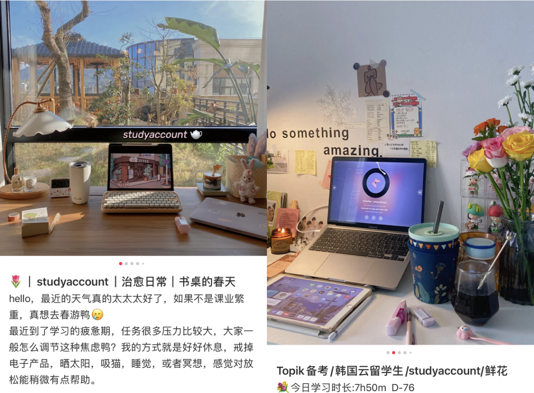 相比于打卡晒笔记,一些SA博主走起“形式主义”:笔记的字迹不仅要好看隽秀,桌面也要妥善布置,摆上泡泡玛特,入镜的iPad设置成好看的壁纸,再加上一层梦幻的滤镜……连带粉丝的关注点也被转移为“如何get同款”。
