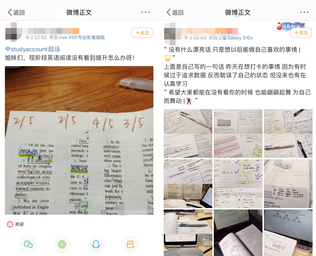 偶尔有学不下去的时候,毛球会打开微博,看看自己关注的考研博主更新什么动态,分享哪些笔记。