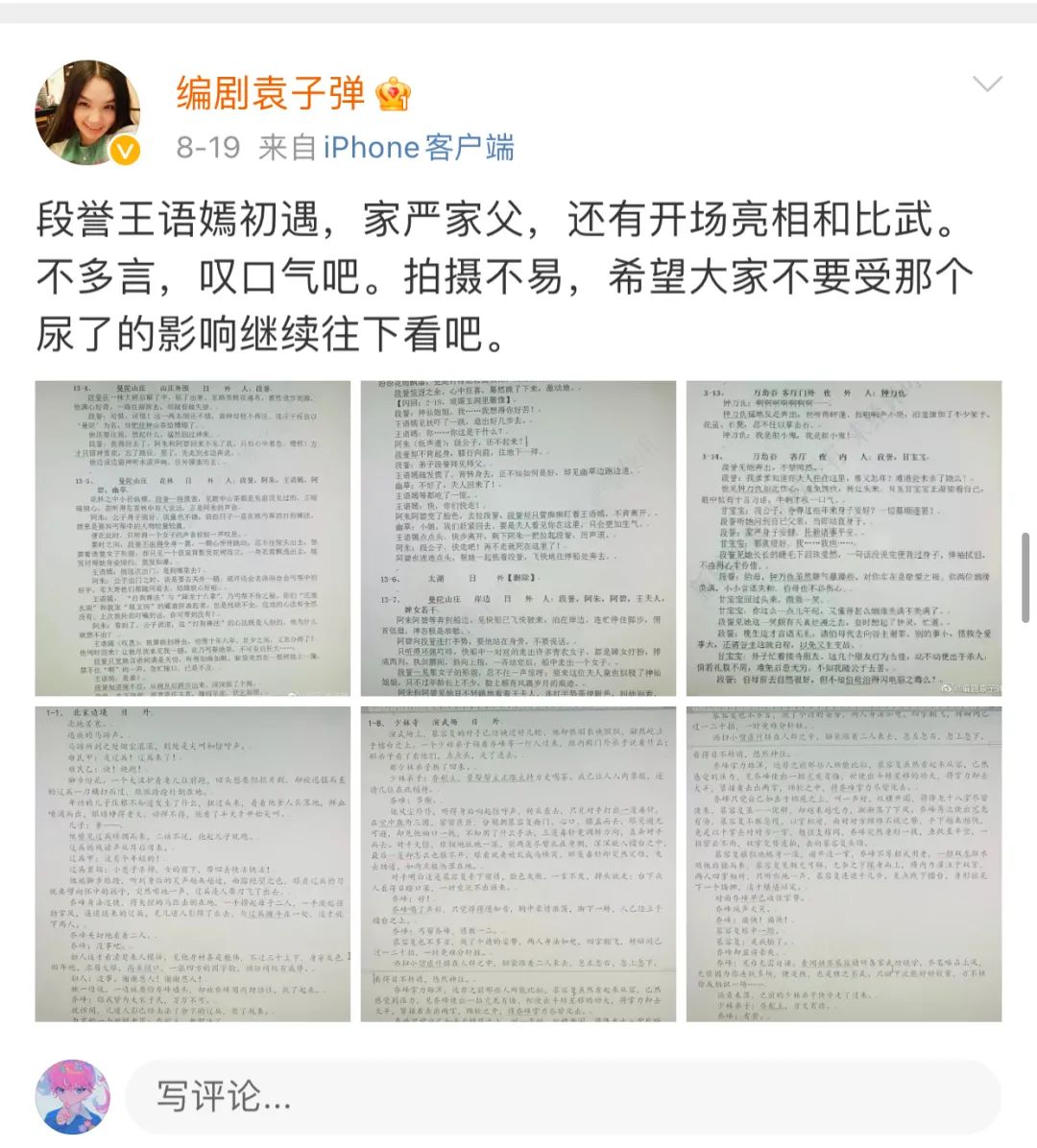 除此之外,诸如“段誉看见王语嫣尿裤子”这类被诟病的剧情,已经成为一出罗生门,不知起源。编剧袁子弹发微博回应该情节所引起的争议,称“拍摄不易,希望大家不要受那个尿了的影响继续往下看吧”,并配了剧本的图片,以此证明这段情节在剧本中并未出现,还回复了网友质疑,指出这段可能是“现场发挥”。
