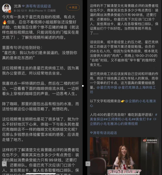此后又有拥护星巴克文化的大V在微博发文力挺,该文用侮辱性语言形容博主“忍住不看视频小姐姐那张还没整好的脸,也勉强忍住那个惨不忍睹的嗓音”,并且称不了解星巴克咖啡和烘焙文化的消费者是“装逼的屌丝,消费承受能力只有99块钱”。