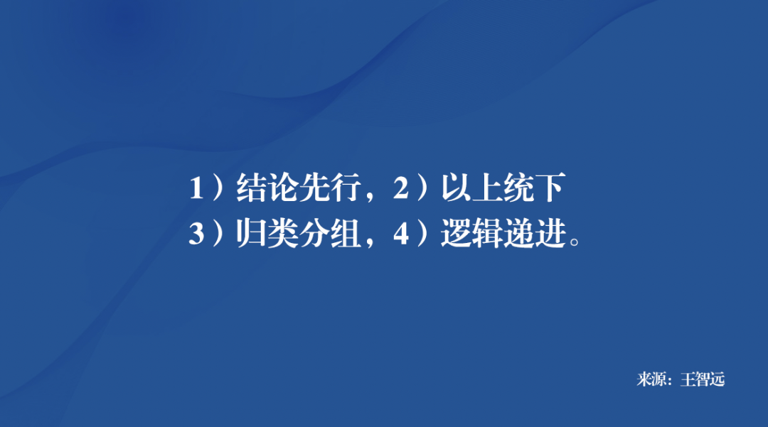主要强调的是:1)结论先行,2)以上统下,3)归类分组,4)逻辑递进。