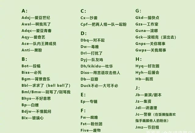 比如字母缩写的起源,有一说法是饭圈比较注意带别家爱豆大名发动态或上广场,为了避免不必要的争端,一般来说会以首字母缩写或代称来代替。