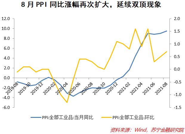 8月份PPI同比上涨9.5%,高于预期,环比上涨0.7%,涨幅均较上月扩大;工业生产者购进价格同比上涨13.6%,环比上涨0.8%,涨幅继续高于工业生产出厂价格。