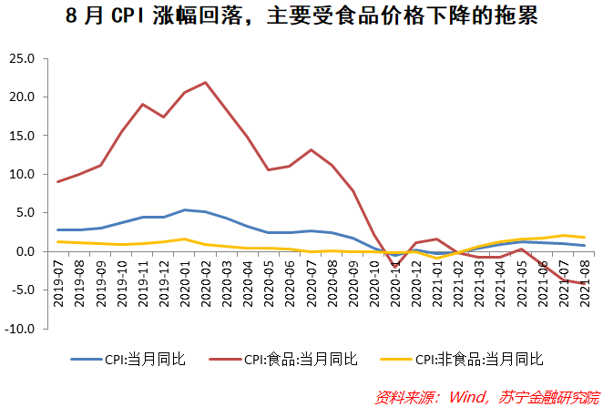 8月份,CPI同比上涨0.8%,低于预期。其中,食品价格下降4.1%,非食品价格上涨1.9%,消费品价格上涨0.3%,服务价格上涨1.5%,涨幅均较上月回落。