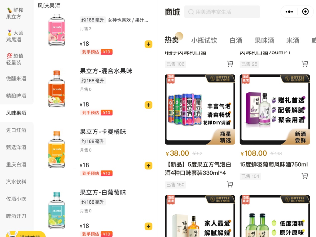 相较于其在外卖平台上线的产品,其小程序商城内的品类更单一,目前仅售卖自家产品,分类主要为白酒、果味酒和米酒,且米酒仅有两款产品,威士忌和定制酒则暂无商品上线。