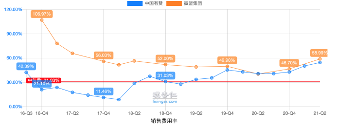 2021年第二季度,微盟销售费用率达到58.99%,同期,有赞销售费用率达54.59%,再往前看,微盟销售费用率从2017年往后呈下降趋势,但自2020年第二季度,逐渐从40.41%开始增长,而有赞自2018年开始,销售费用率几乎一直呈增长状态。