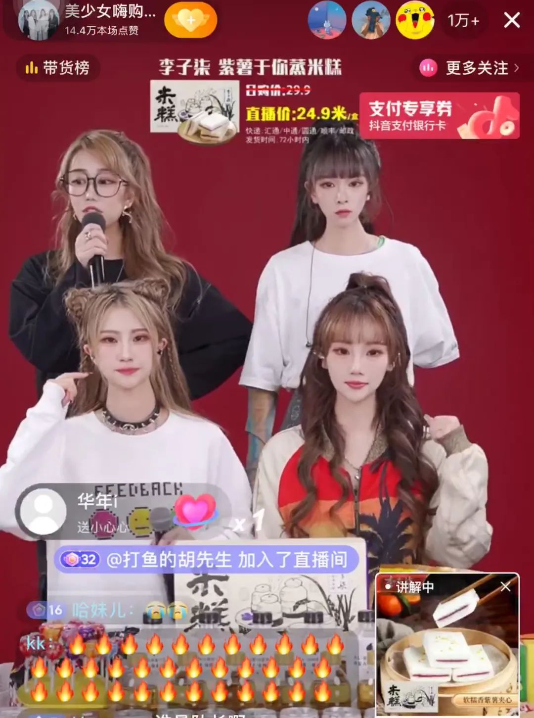 屏幕里,四个年轻女孩打扮精致,一边身体随动感的背景音乐摇摆,蹦着迪;一边拿着话筒与观众聊天,然后随机介绍着底部的零食和日常用品。