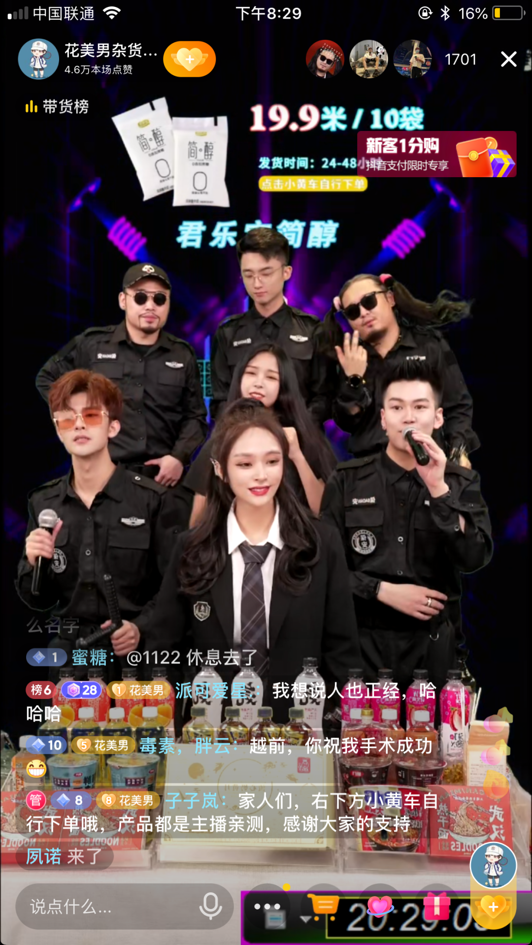 “花美男杂货铺”的主播多达8名。除了两名女主播,其他都是男性。主播们轮流上场,每次直播,都有6名以上主播挤在直播镜头前。前排的主播负责讲解商品,与观众互动,后排的主播随着音乐蹦迪,调控气氛。