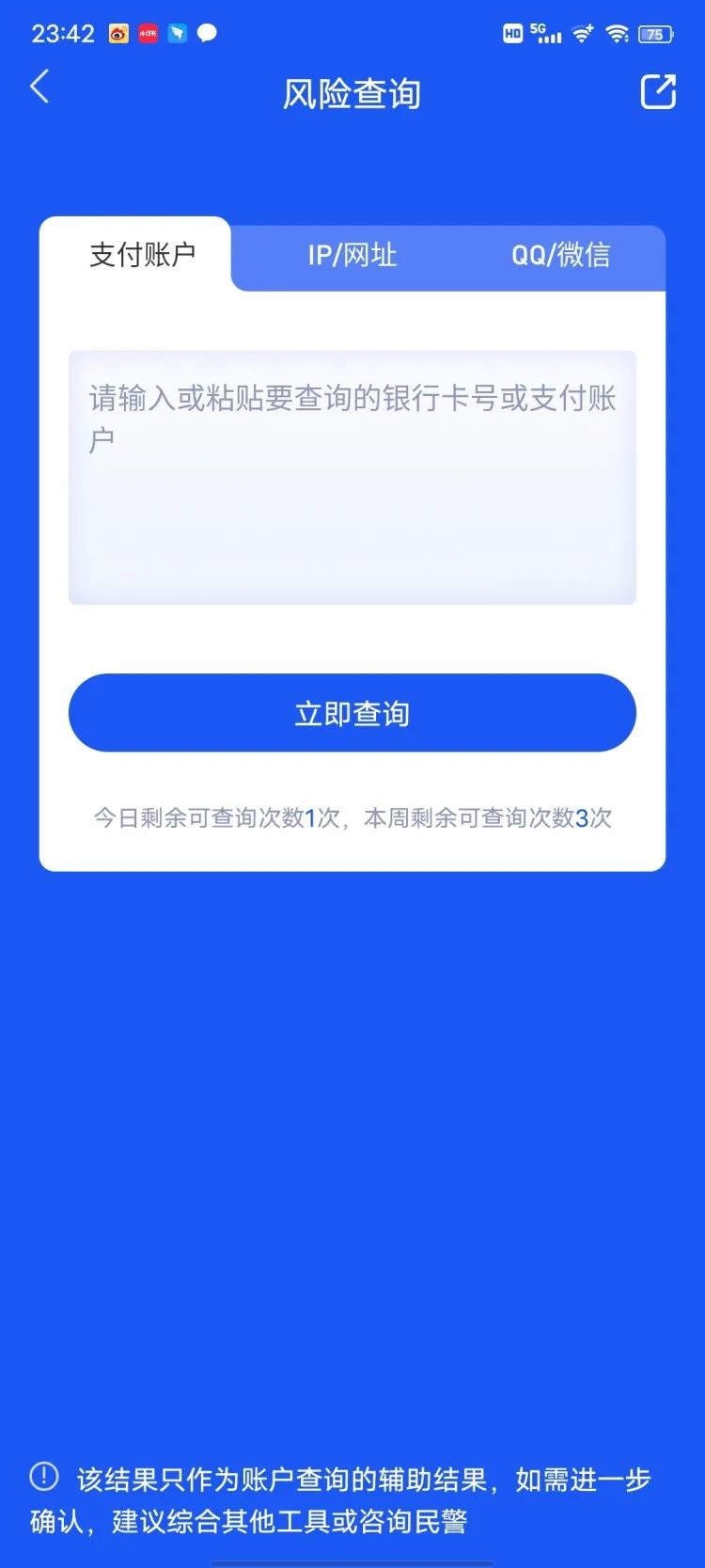 反诈App还有一项功能是“风险查询”,用来查验对方给的支付账户或银行卡号是否存在异常(也可以查证对方给的网址和微信/QQ账号,不过每项每周只提供三次查询机会,每天至多一次)。身份核实和风险查询双管齐下,对用户判断对方到底是不是一个经验老道的骗子应该是够用了。