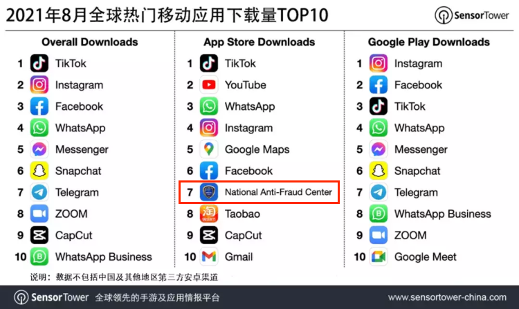 网友的留言真实反映了陈国平直播的热度。在直播了一段时间之后,国家反诈中心App迅速冲到了苹果App Store免费App排行第一的位置,且根据Sensor Tower商店情报的最新数据,这款App上榜了App Store今年8月全球热门移动应用下载量Top10,排名第七。