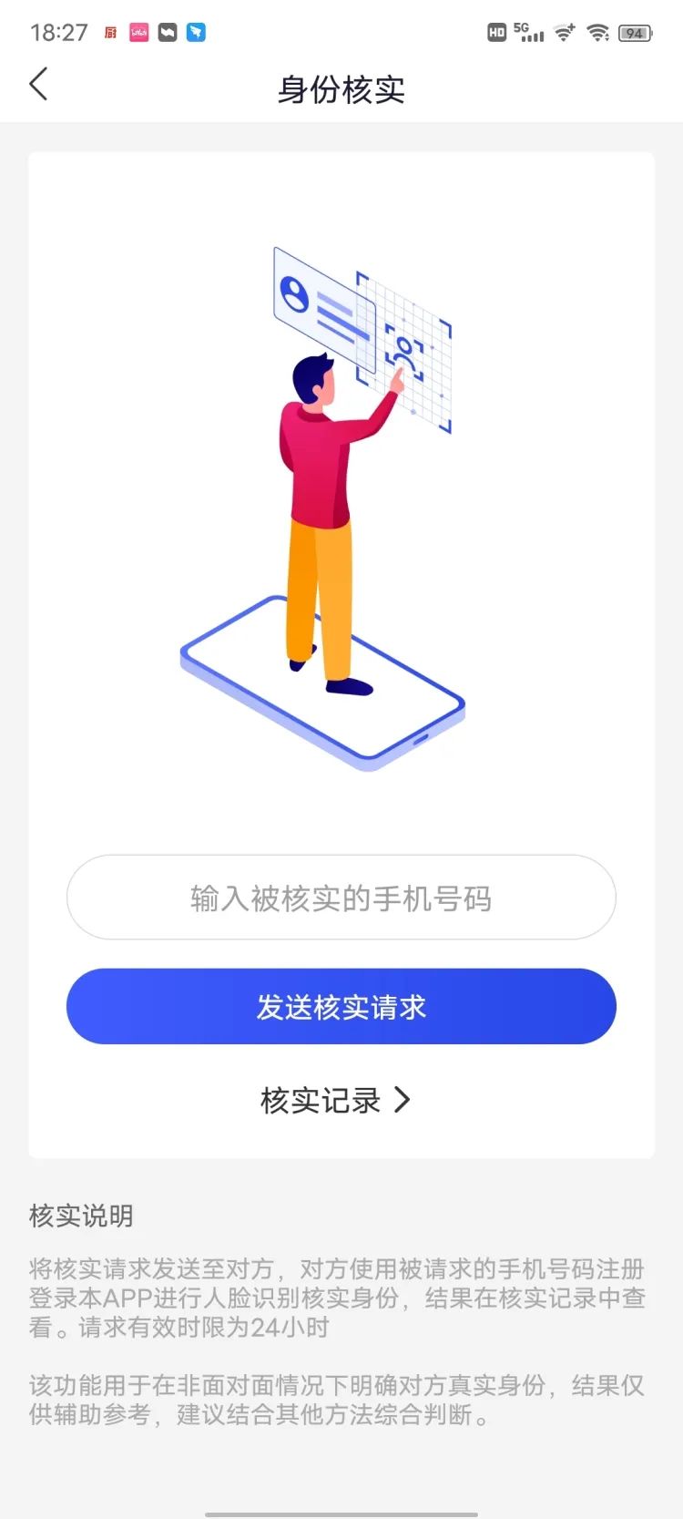 骗子很可能会用不是公安数据库中标记的诈骗电话来给你打电话或发短信,来电预警无法识别,这个时候如果你觉得对方身份可疑,就可以用反诈App的“身份核实”功能来验证对方身份的真实性。方法是输入他的电话号码后发送请求,他会收到一条短信,引导其进入反诈App进行人脸识别核实身份。
