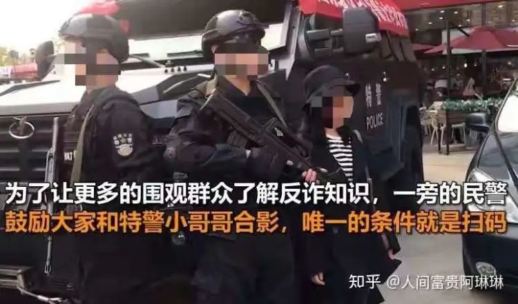 杭州钱塘新区为了宣传国家反诈中心App,还搬出了特警,不过不是为了维护秩序,而是鼓励大家和年轻帅气的特警合影——前提是扫码下载反诈App。