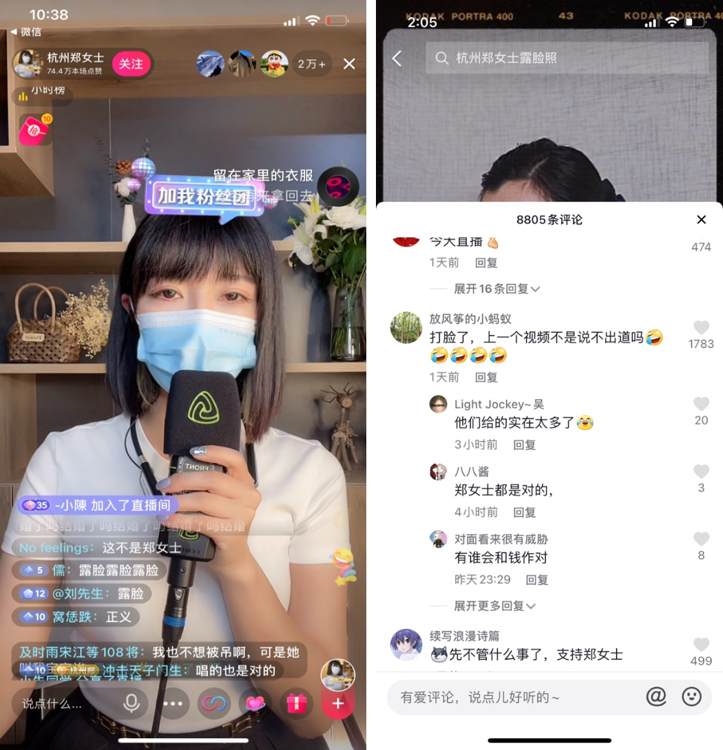 而郑女士脸上那只标志性的口罩,也无法保持神秘感。直播中,郑女士表示,自己获得100万粉丝之后,就会摘掉口罩。