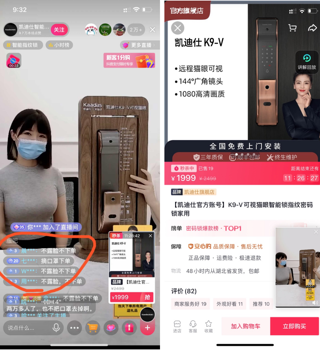 9月9日,郑女士在凯迪仕智能门锁的抖音直播间里出场了短短几分钟。她依旧戴着标志性的口罩,很多直播间观众甚至没听清她说了些啥。但她的出现,为这个品牌的抖音直播间带来了有史以来的最好成绩:平时仅1万人场均观看,峰值在线人数不到百人,这场直播中超88万人次观看,峰值达到3万人;平时每场直播仅几十人的涨粉,一场直播下来涨了5000多粉,并引导至天猫旗舰店完成成交。