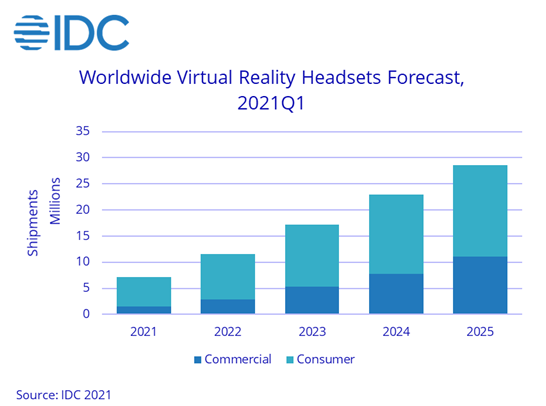 根据国际数据公司IDC的数据,今年第一季度全球VR头显设备出货量和去年同期相比增长了52.4%,在2021-2025年间,全球VR头显设备出货量有望达到约41.4%的年均增速。