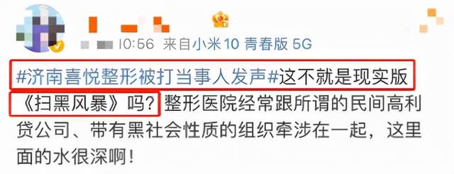 视频曝光者是这家整形医院的前员工,视频曝光后其通过微博账号@喜悦整形小o发声,称在讨要工资过程中也遭到了老板刘某明,也就是视频中的女老板的殴打。有网友将这段整形医院的风波调侃为“医美界的《扫黑风暴》”。