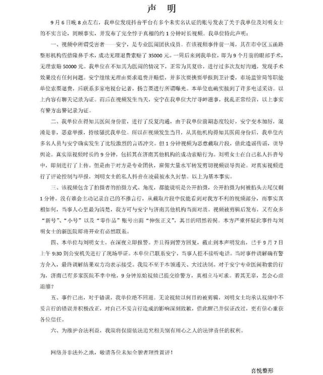 9月7日上午,涉事整形医院官微发表声明称,视频中的女顾客安女士是专业医闹团伙成员,背后有专业团队在操纵炒作此事。声明还认为视频遭到恶意剪辑,未能反映事件全貌,并提到安女士向院方无理索赔5万元。