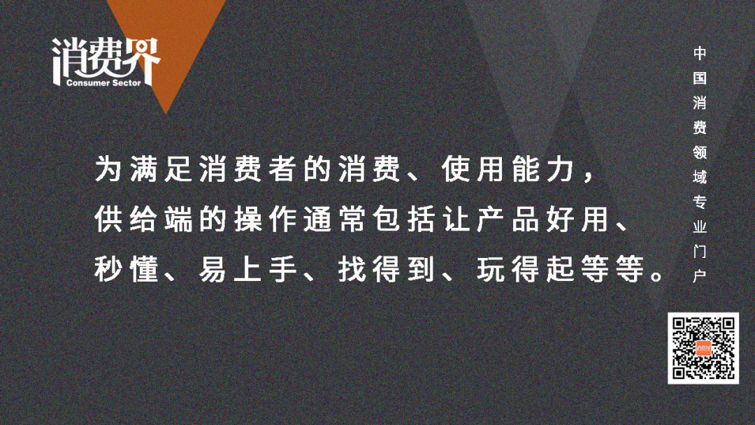 为满足消费者的消费、使用能力,供给端的操作通常包括让产品好用、秒懂、易上手、找得到、玩得起等等。