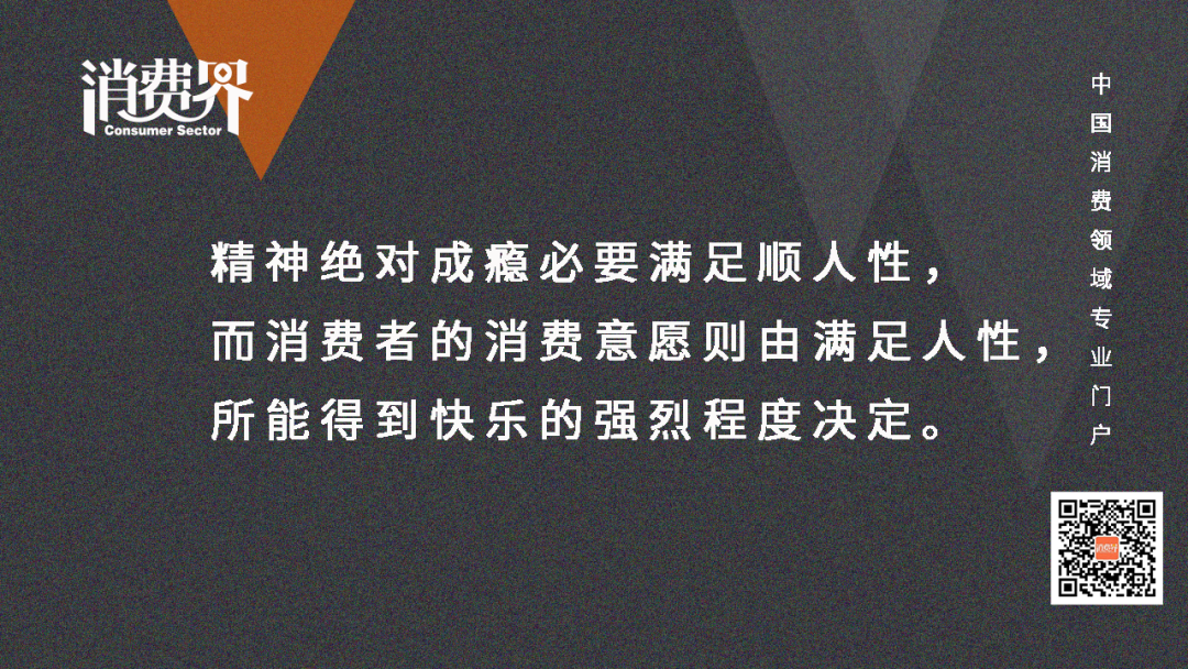 精神绝对成瘾必要满足顺人性,而消费者的消费意愿则由满足人性,所能得到快乐的强烈程度决定。