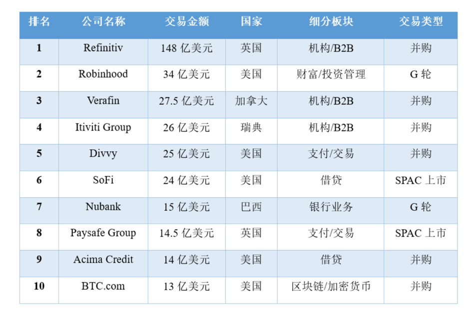 2021年上半年十大全球金融科技投融资交易,来源:KPMG