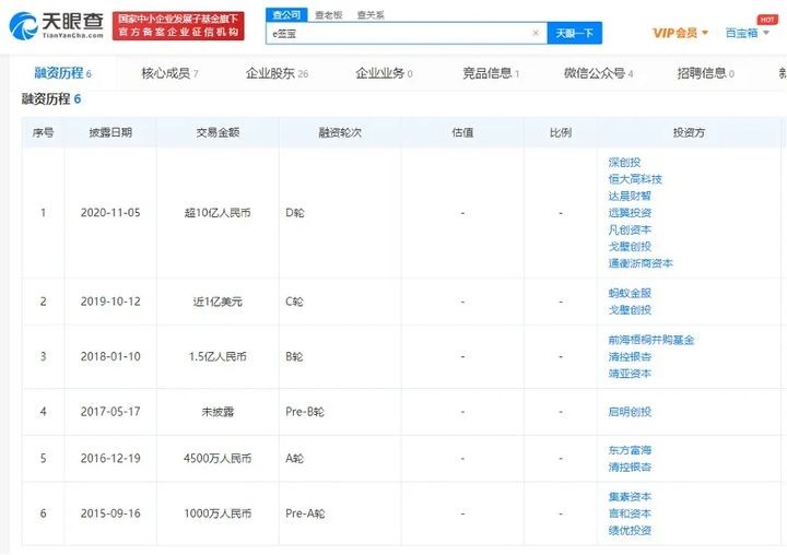 2018年,云栖大会上,蚂蚁金服与e签宝联合发布相关合约,随后2019年,蚂蚁金服领投e签宝C轮近1亿美元融资。