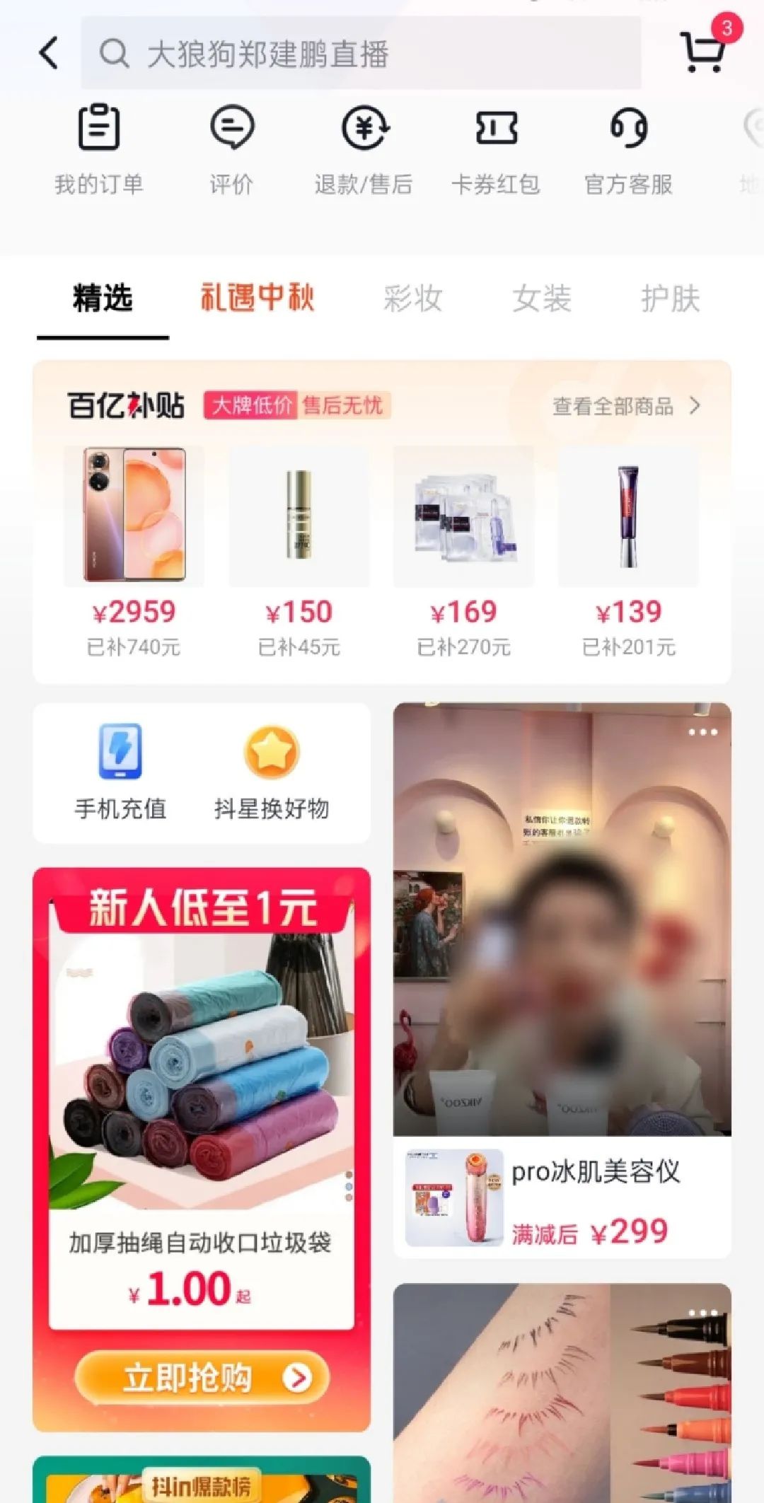 抖音商城的页面布局与淘宝、天猫、京东等APP类似,均为商品双瀑布流;并按照行业惯例,将SKU划分为女装、食品饮料、配饰、母婴、护肤等20多个品类。此外,还在搜索框下方新增了我的订单、评价、退款售后等常用功能。