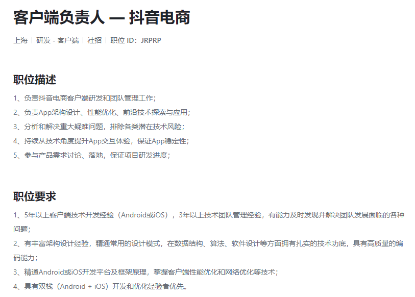 字母榜注意到,字节跳动官方网站显示,抖音电商正在招聘“客户端负责人”,负责研发和团队管理工作,包括APP架构设计、性能优化、前沿技术探索与应用等。