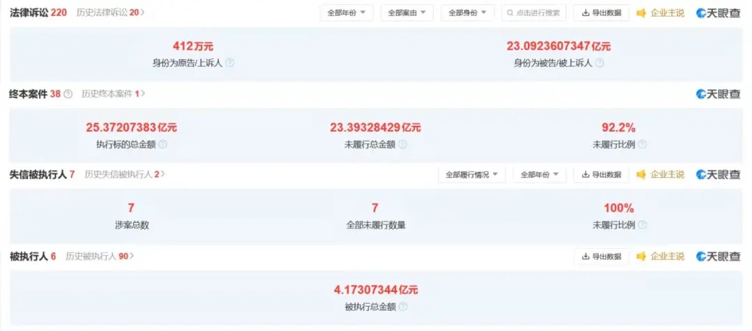 在科迪集团所有的220件法律诉讼中,身为原告上诉人涉案金额合计412万元、身为被告人涉案金额合计23.09亿元。科迪集团收到的限制消费令更是高达53条,在38件终本案件中,执行标的总金额25.37亿元、未履行总金额23.39亿元,未履行比例高达92.2%。
