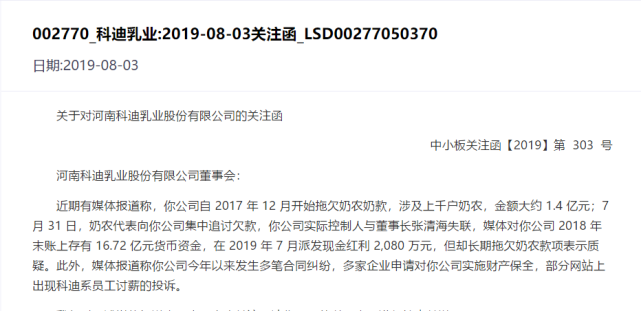 2019年8月新京报文章《科迪集团陷危机:科迪乳业欠巨额奶款,科迪速冻欠薪停产》,透露出科迪集团债务问题愈发严重,文章更是引发了中小板公司管理部下发的关注函。