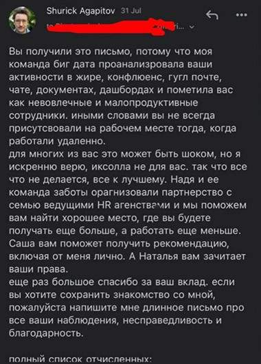信中提到,Xsolla的大数据团队分析了员工在Jira、Confluence, Gmail、聊天、文档、仪表板等应用中的活动,然后将那些行为路径不总出现在工作场景中的员工标记为“没有生产力的员工”。