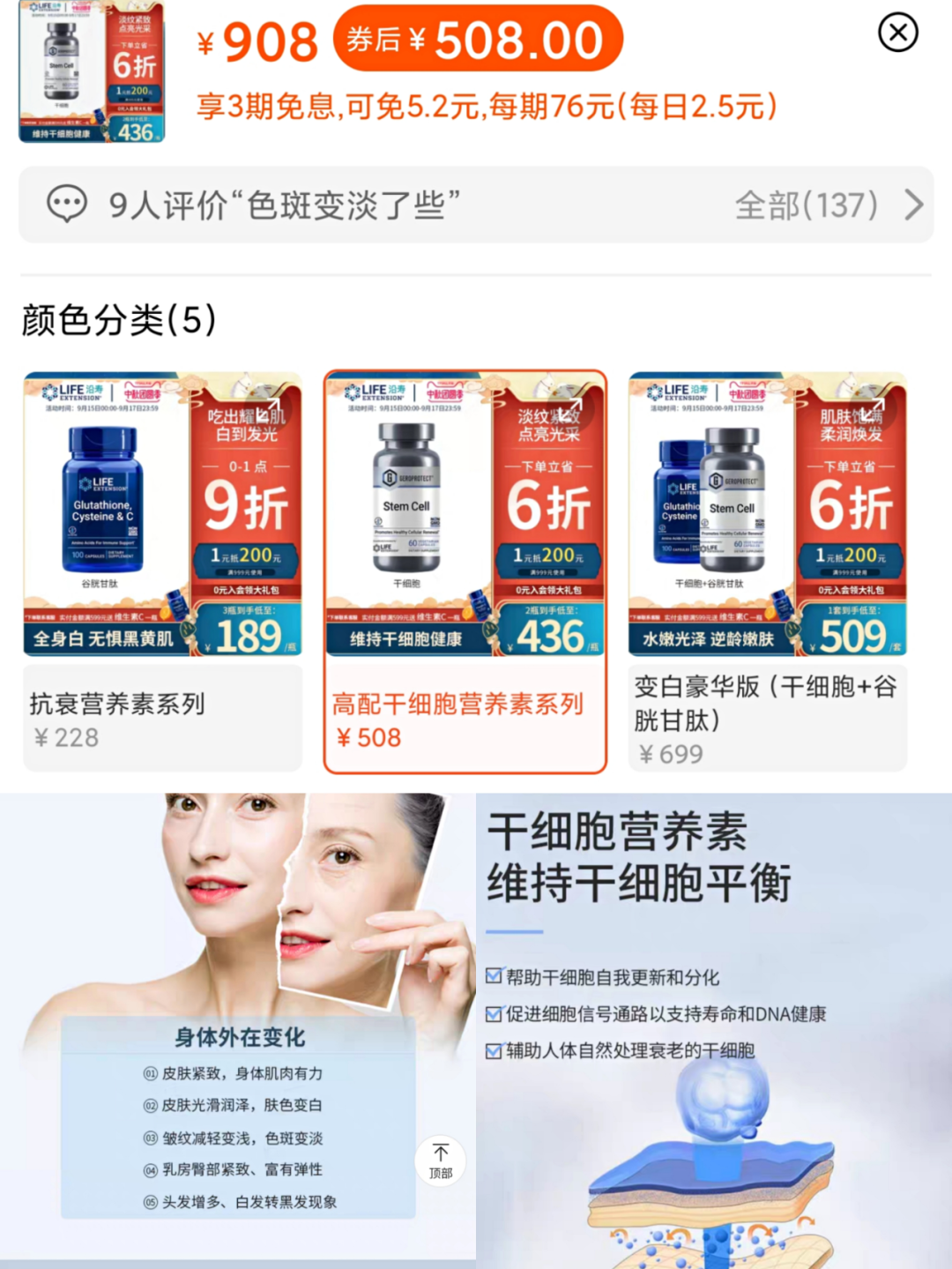 燃财经在某电商平台搜索“干细胞”,与之相关的“干细胞精华”、“干细胞面膜”、“干细胞胶囊”,以及“干细胞滴眼液”等等产品层出不穷且价格较贵。一瓶60粒装的“干细胞营养素”原价竟然高达近千元,而在折后的价格也在500元以上。在产品介绍上,明确写道“干细胞营养素可以维持干细胞平衡,辅助人体自然处理衰老的干细胞。可以给您想要的健康年轻态,即皮肤紧致、肤色变白、头发增多等等。”