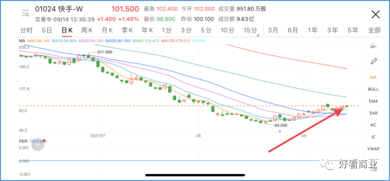 此前港股跌幅居前的快手在止跌回升,目前为止的一个月内,已较8月20日创下的历史低点64.5港元最高涨近63%。
