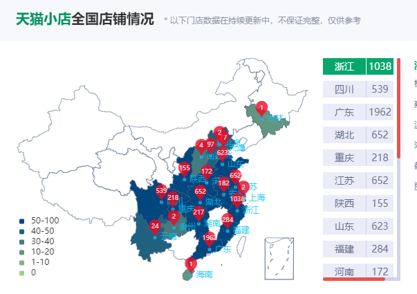 然而,天猫小店与之相对比,总体数量就相形见绌了,截止到2020年8月,据不完全统计,天猫小店的数量为6904家,其中广东省省拔得头筹1962家,浙江省紧跟其后1038家,东北地区分布极少,北京和上海只有4家,很明显天猫和京东的主战场在华北和华南的三四线城市。