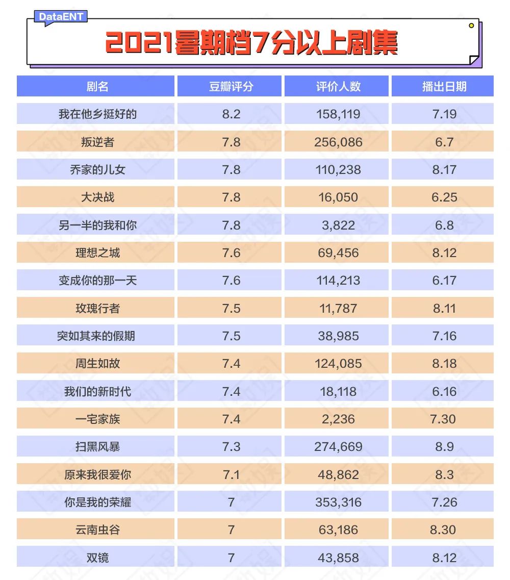 然而,打开豆瓣App,安妮却发现最近的好剧似乎有点“扎堆”。粗略一算,光是暑期档,7分以上的剧集就高达17部,其中有耳熟能详的,也有从来没听说过的,这反倒让她一时有些不知所措。