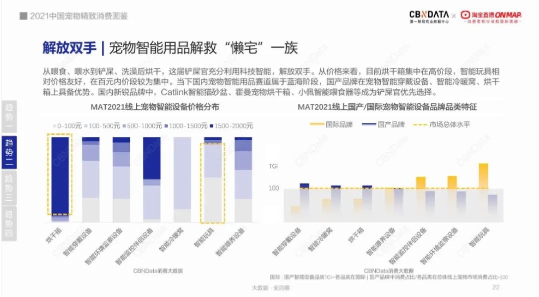 国产品牌在烘干箱、智能穿戴设备、智能冷暖窝等品类更受消费者喜爱。烘干箱作为绝对高客单价商品,主要价格分布区间在1500-2000元之间,霍曼为该品类的TOP 1。但在智能玩具领域,国际品牌更受消费者青睐,典型如美国宠物品牌AFP等。