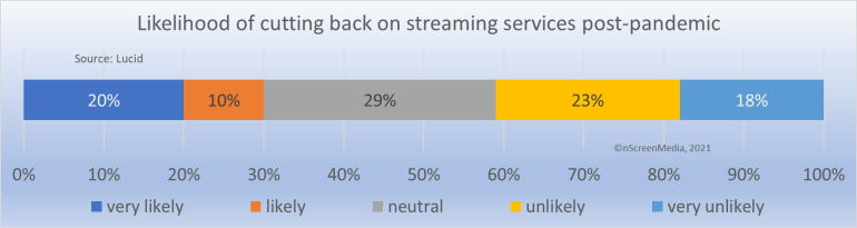 研究机构Lucid的调查显示约40%的人认为后疫情时代不会减少在家用流媒体追剧的时间和投入,30%的人表示将会减少,其他30%的人还举棋不定,但人们在调查中往往会高估自己去做某件事的可能性,因此流媒体服务失去的用户群规模其实要更小。