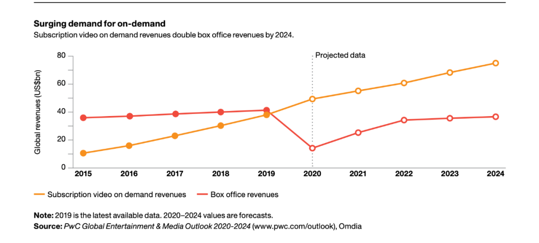 短期来看,受人们外出玩耍的影响,流媒体影视服务的订阅数将会小受挫折,但长期来看,用户倾向在家追剧和最新院线大片仍将备受宠爱,疫情还改变了影院和流媒体影视服务之间的权力关系,PwC一项研究显示,流媒体服务的收入将在2024年达到影院收入的两倍。