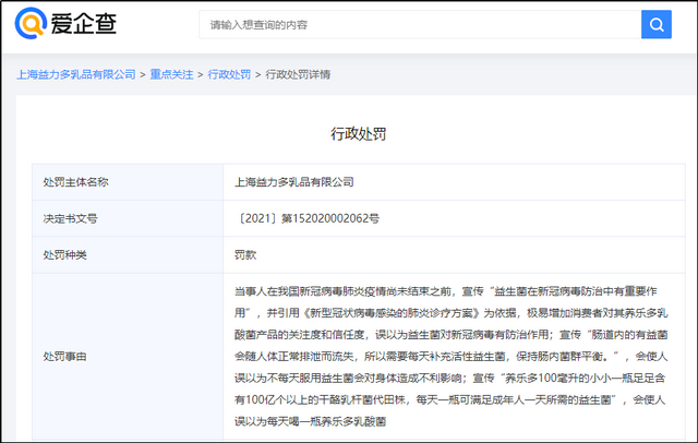 百度爱企查显示,养乐多关联公司上海益力多乳品有限公司因在我国新冠病毒肺炎疫情尚未结束之前,宣传“益生菌在新冠病毒防治中有重要作用”等内容,被上海市浦东新区市场监督管理局处以罚款45万元。