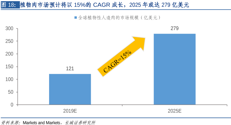 全球植物肉市场增长极为迅速。根据MarketsandMarkets数据,2019年全球植物肉的市场规模约为121亿美元,预计每年将以15.0%的复合增长率增长,到2025年将达到279亿美元。作为对比,2020年全球食品饮料行业的同比年增长率仅为2.9%。