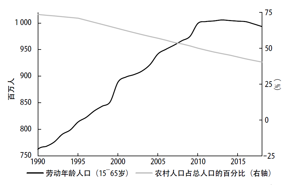 从2000年到2017年, 中国农村劳动人口大规模转移至城市, 使城市人口比例提高了23个百分点以上, 城市人口增加了约3. 7亿人。