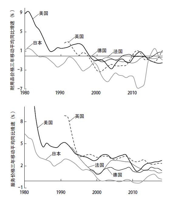 近30年来,大多数发达经济体的耐用制成品价格趋于有规律地下降,相比之下,发达市场经济的服务业通胀率从20世纪80年代开始则是急剧下降, 90年代以来趋于稳定, 接近2%的水平。![]()
