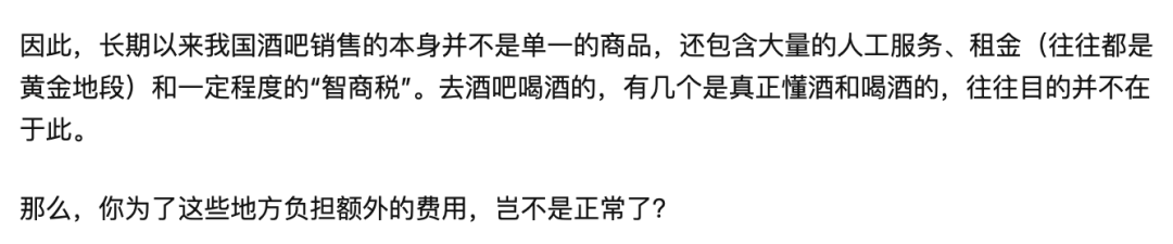 在问题之下,有这么一个回答“长期以来,我国酒吧销售并不是单一商品,包含大量的人工服务、租金(黄金地段)和一定的‘智商税’”。
