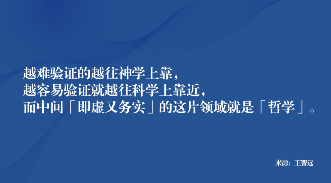 越难验证的越往神学上靠,越容易验证就越往科学上靠近,而中间「即虚又务实」的这片领域就是「哲学」;换句话说:神学无边际,科学有边界,哲学中间徘徊做承接。
