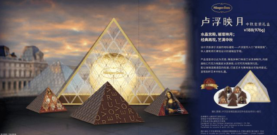 冰激凌月饼贵得更离谱。哈根达斯今年推出了十款冰淇淋月饼礼盒,天猫旗舰店售卖的价格从268元-1288元不等。最便宜的268礼盒中,月饼只有4枚;最贵的一款,是哈根达斯与卢浮宫博物馆的联名款“卢浮映月”冰淇淋月饼礼盒,售价1288元。